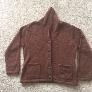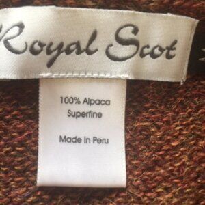 Royal Scot Superfine Alpaca knitted Cardigan Size Medium. Chest 41", Length 23-24". Auburn multicolored yarns. Has a Wide V-Neck Collar presence. Has a few wrinkles, that is what the camera is picking up can be steamed out. Otherwise in EXCELLENT condition, no snags or missing buttons. etc.