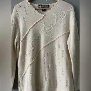 This elegant cream V-neck sweater features delicate floral embroidery, offering a touch of sophistication to your wardrobe. Perfect for any occasion.