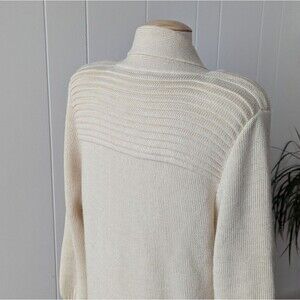 Cream colored Alpaca wool long duster sweater by Peruvian Link. Made in Peru. Long open front duster sweater. Has two front pockets. Has sewn-in shoulder pads and a horizontal pleated design at the shoulders and across the upper back. Made of Alpaca wool. Measures approx. 23" armpit to armpit with front of sweater closed (see photo), sleeves are 24" long. Sweater is 39" long. In excellent condition.