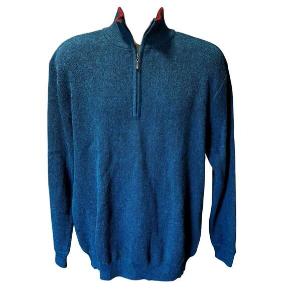 Amazing quality sweater from Alpaca Golf by Inca Fashions. Made of 100% Peruvian Alpaca. 1/4 zip style. Teal with contrasting burgundy inner collar. Size Large. Preowned, no flaws.