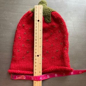 Classic Alpaca brand child-sized alpaca wool hat in red with green top and seed pattern. Used, but in good condition. Best fits toddler to young elementary-aged children.