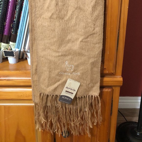 Tan/Brown Alpaca wool scarf. Small white Alpaca embroidery near the end. Standard length.