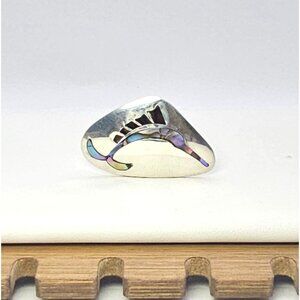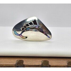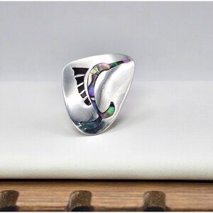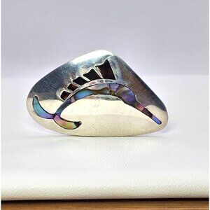 This Alpaca silver earring features an elegant abalone inlay, showcasing a unique swordfish design. Ideal for crafting or upcycling into a bolo tie, it weighs 4.57 grams and measures approximately 1.25 inches. Its sophisticated look makes it a versatile addition to any jewelry collection.