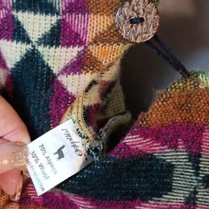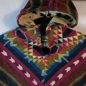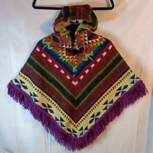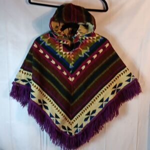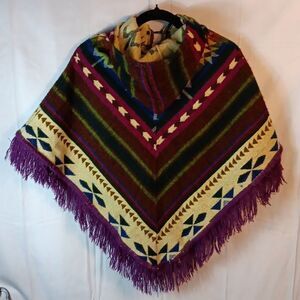 Vibrant poncho with a hood. Features geometric patterns. Fringed edges add style.