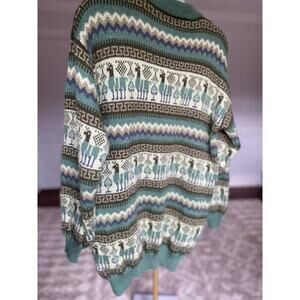 This vintage alpaca wool sweater by Pincho Poncho features intricate Peruvian-inspired patterns in green, cream, and blue tones. Handcrafted in Peru, it offers unparalleled warmth and softness, perfect for a cozy and stylish winter.