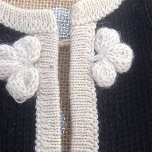100% alpaca cardigan sweater . Black with Creme accents. Hidden buttons and 3/4 sleeves. Made in Peru. Lord Patricio