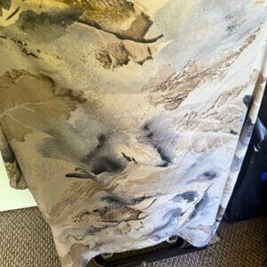 The reversible coat with hood made from super soft alpaca wool. No tags but it does fit like a woman's size 12/14. The hat is also wool (not sure type) but it is made in Italy (one size fits all) and the scarf feels like a silk scarf but no tag to verify it. The three pieces make a beautiful cool weather ensemble. The coat has been worn but still in great condition- no snags or spots