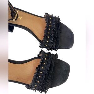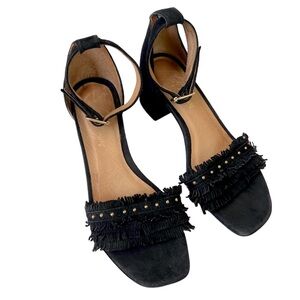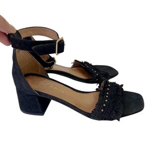 Alpe Women Black Leather Suede Fringe Block Heels Ankle Strap Sandals 37 7