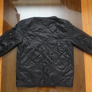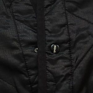 - Ripstop nylon with a light fill features rib-knit cuffs+full-length button front closure.