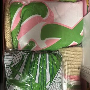 Alpha Kappa Alpha beach float, raffia tote bag, visor, and beach towel