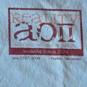Alpha Omicron Pi vintage light blue t-shirt is from the 2004 Leadership Institute Conference when it was held in person. The crew neck shirt is 100% cotton, it has the Leadership Institute location on the front and has the phrase real topics, real solutions, real life on the back