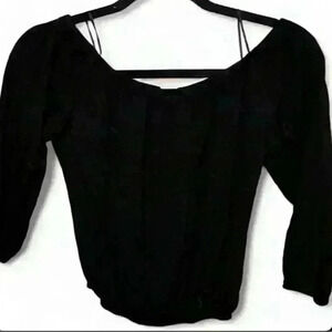 Keywords: Alpha, women's blouse, velvet, off-the-shoulder, lace trim, black blouse, casual wear, evening wear, versatile top, pre-owned, USA made, solid pattern, basic style, small size, regular fit.