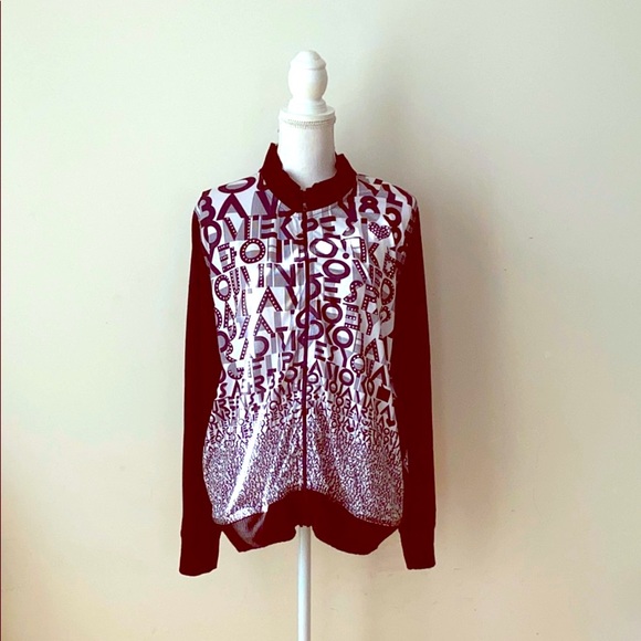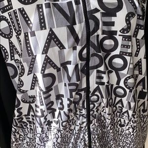 Letters and numbers printed throughout this zippered jacket.