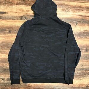 Alphalete hoodie with dark camo pattern. Features front pocket and drawstring hood.
