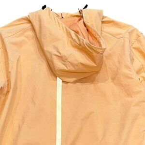 Alphalete EXP Tech Windbreaker Pullover Quarter Zip Hooded Jacket Peach Large . This jacket is made of 92% Nylon, 8% Elastane. It measures Underarm to Underarm 23", Length 26". This jacket is in good, used condition. There are no rips, tears, stains or damage. Ships from a Smoke Free Home. Any questions, please ask. All reasonable offers welcome.