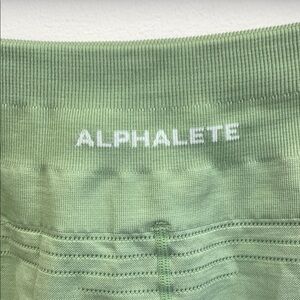 Experience ultimate comfort and style with Alphalete's green leggings, featuring a soft, textured fabric and a flattering tapered fit. The elastic waistband ensures a snug fit, while the ankle cuffs add a touch of modern flair. Perfect for casual outings or relaxed days at home. No size tag. Looking up sizes seems comparable to xs/s. Please see measurements below never worn.