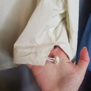 Adjustable high neck fitment with elasticated pull cords at bottom / waist for adjustable fit