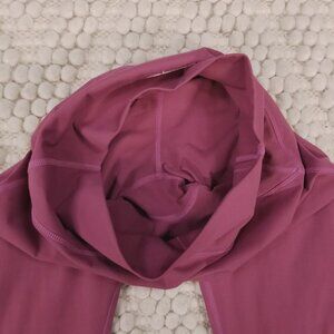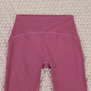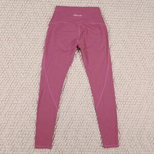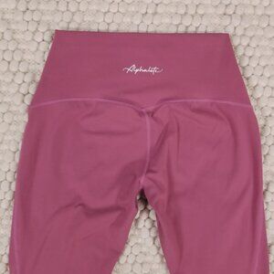 Alphalete "Surface Elevation Leggings" in "Candy Apple" dusty rose/mauve pinnk. Size tag removed - size small (S) based on measurements below - recommend comparing measurements below against a similar style of leggings. These compressive leggings feature a high waist fit, contouring rear seam, wide waistband, and seamless front.