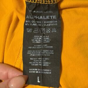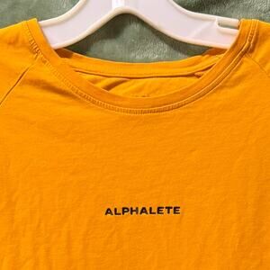 Alphalete Performance short sleeve tee in bold mustard yellow. Minimal logo detail at chest, lightweight stretch cotton blend, and athletic cut. Perfect gym-to-streetwear piece.