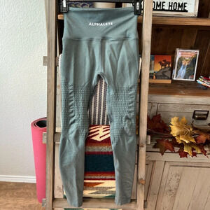 EUC Alphalete women’s leggings size small. These leggings are in like new condition! A gray/green color way, high waisted, extra contour behind knees! Check photos for measurements in inches!