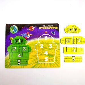 Vintage Alphie the Electronic Robot by Playskool (1978). Includes original box and multiple game sheets. Robot battery wiring needs repair as the black wire has broken off from the 9-volt battery connector. Game sheets are in good condition; box shows typical wear for age. A great restoration project or display piece for vintage toy collectors.