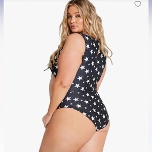 Stylish one piece with star pattern. Features a tie front design. Comfortable and chic.