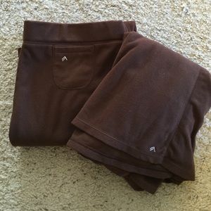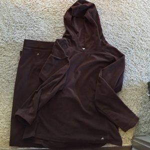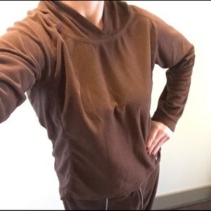 Alpine Design Brown Fleece Track Suit. Size XL but prob would fit a LG better than XL unless you want a tight fit then XL would work. Pullover hoodie. Drawstring bottom so if you like it loose, could fit Med too.