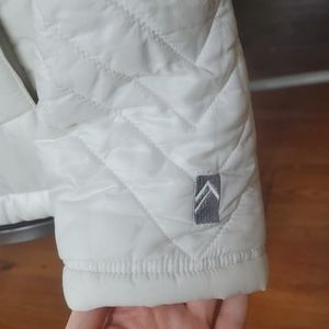 Alpine Design Womens White Puffer Jacket. Light Blue/Gray Lining. 2 outside zippered pockets, 1 inside pocket. Adjustable drawstring bottom. Polyester fill. Size Medium.
