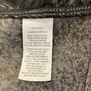 Black and grey jacket. Sleeves are a softer material while the front and back are more like a puffer jacket. Smoke free home. No tags, but has never been worn!