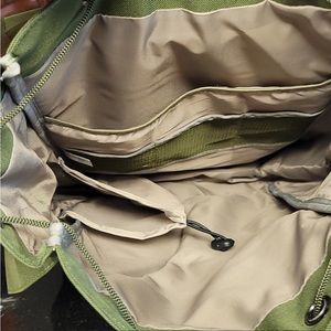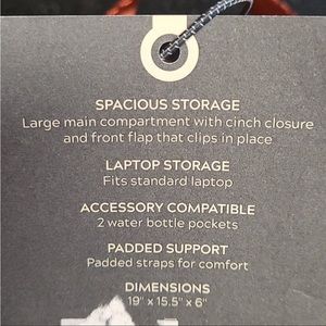compartment with cinch closure and front flap that clips in place, standard laptop storage compartment, 2 water bottle pockets, padded support straps, NWT!!