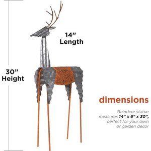 🧿30"H METAL REINDEER LAWN DECORATION: Metal reindeer statue is the perfect festive addition to your outdoor holiday display 🧿DURABLE AND LONG-LASTING: Constructed of high-quality sheet metal and rebar legs to withstand prolonged outdoor use 🧿WIRE-FREE: Statue has no lights, allowing for placement wherever you want without needing to worry about being near an outlet 🧿EASY STORAGE: When winter is over, simply disassemble the neck part of the statue for more convenient storage 🧿OVER 2 FT. TALL: Reindeer statue measures 14"L x 6"W x 30"H, perfect for your lawn or garden décor. A one-year manufacturer's warranty from date of purchase is also included. Transform your lawn into a winter wonderland with the Alpine Corporation's 30"H Metal Rustic Standing Reindeer! This stunning reindeer is the perfect addition to your holiday display. It's constructed of high-quality sheet metal and is built to withstand prolonged outdoor use with rebar legs. The sheet metal design provides a beautiful display when placed in outdoor settings, making the reindeer perfect for your front yard, lawn, or garden. When winter is over, you can disassemble the neck for easier storage. At over 2 ft. tall, the Alpine Corporation Rustic Standing Sheet Metal Reindeer measures 14"L x 6"W x 30"H, perfect for your yard.