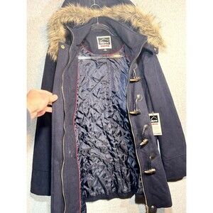 Alpine Swiss Duffy Wool Coat Women's M Navy Faux Fur Trim Hooded Toggle Button.