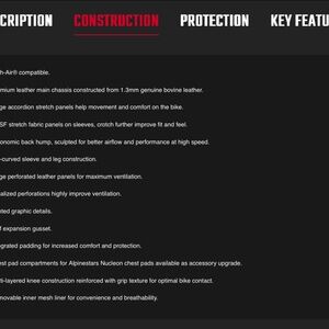 The Missile Ignition Leather Suit is constructed of premium race-grade 1.3mm genuine bovine leather for superior abrasion resistance, punctuated with strategically-placed accordion stretch gussets and stretch fabric panels to allow for maximum rider mobility on the motorcycle. Alpinestars GP-R protectors and external sliders at the joints offer unparalled impact and abrasion resistance, while localized perforations and an airflow-optimized aero hump ensure the rider stays cool and streamlined during the ride. The Missile is also Tech-Air® compatible.