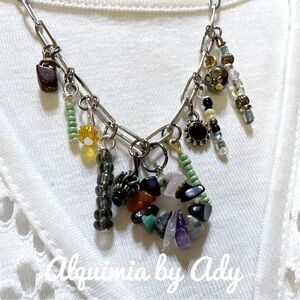 Discover the enchanting Alquimia Necklace, a stunning piece that combines the bold colors of black and orange. This necklace features a collection of distinctive pendants, each crafted to add a unique flair to your ensemble. Perfect for making a statement, this jewelry piece embodies elegance and individuality.