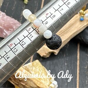 Discover the Alquimia ring, a stunning piece that combines the bold texture of black lava rock with the smooth elegance of white pearl-like beads. This unique design offers a striking contrast, making it a standout accessory for any occasion.