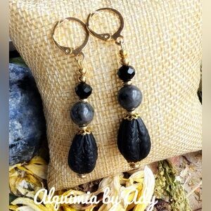 Elegant earrings with intricate silver teardrop design. Accented with black stones. Perfect for any occasion.