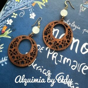 These Alquimia earrings feature a captivating blend of rich brown wood with a leopard print pattern and gold accents, creating a bohemian-inspired look. The addition of a pearl-like bead adds a touch of elegance, while the artisanal craftsmanship ensures each piece is unique. Perfect for those who appreciate a fusion of natural elements and sophisticated design.