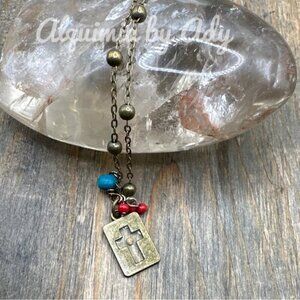 Elegant brass earrings with turquoise and red accents. Features a cross charm. Perfect for any occasion.