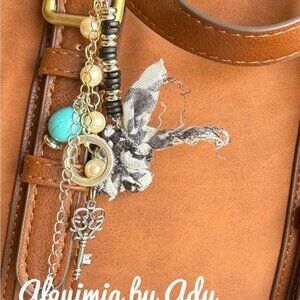 Elegant key and card holder by Alquimia. Features brown leather with silver chain accents. Includes turquoise and pearl embellishments. Stylish and functional.