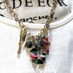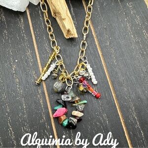 The Alquimia Gold Charm Cluster Necklace showcases a chunky gold chain adorned with an eclectic mix of charms and pendants. This bohemian piece features a small key charm, vibrant red coral, and smoky gray beads, creating a unique and eye-catching accessory. Perfect for adding a touch of elegance and individuality to any outfit.