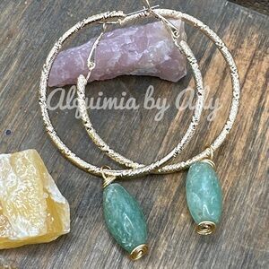Elegant gold hoop earrings. Features green stone accents. Perfect for any occasion.