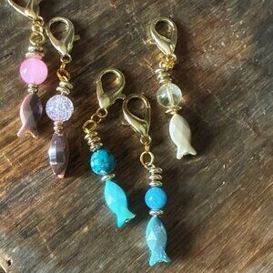 Elegant charm with gold accents. Features a blue bead and a green pendant. Perfect for accessorizing.