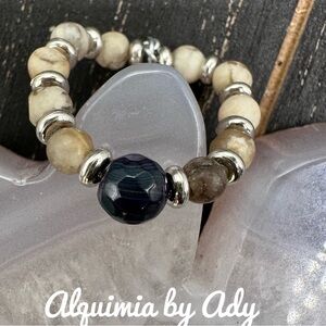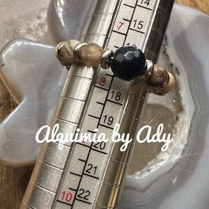Alquimia Gold and Tan leopard jasper beaded Ring with tourmaline Charm