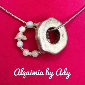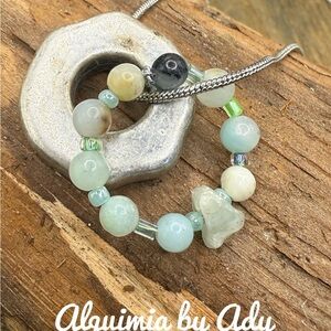 Elegant beaded necklace by Alquimia featuring soothing green and silver tones. Perfect for adding a touch of sophistication to any outfit.
