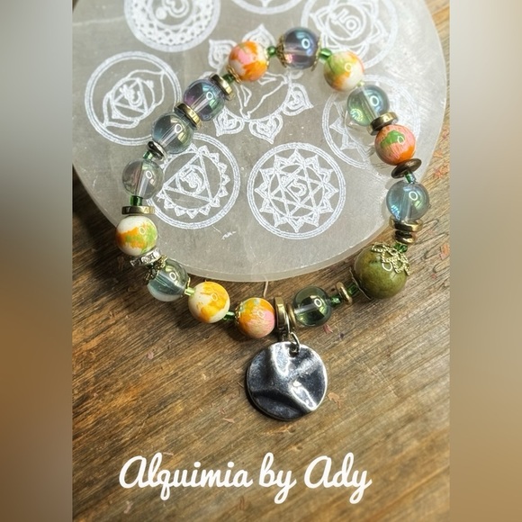 This Alquimia bracelet showcases a harmonious blend of green and yellow beads, highlighted by a striking pendant charm. The mix of textures and finishes, from glossy to matte, creates a captivating and organic design perfect for any occasion.