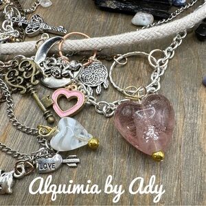 Unique charm necklace by Alquimia. Features silver and gold tones. Adorned with keys, hearts, and intricate designs. Perfect for adding a statement to any outfit.