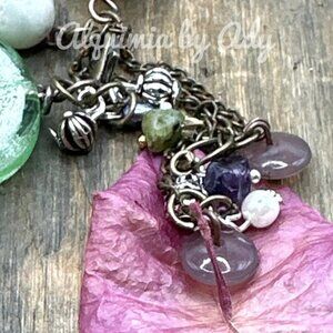 Elegant bracelet with a mix of beads. Features green, purple, and silver tones. Perfect for any occasion.