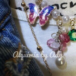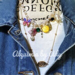 Charming necklace with colorful beads and pendants. Features butterfly, pearl, and gemstone accents. Perfect for adding a playful touch.