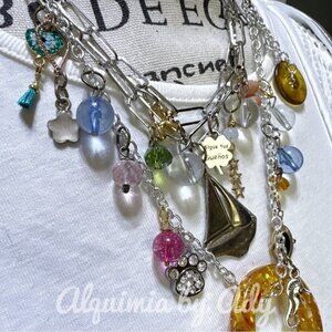 Vibrant necklace with diverse charms. Features sailboat, pearls, and colorful beads. Unique and eye-catching design.