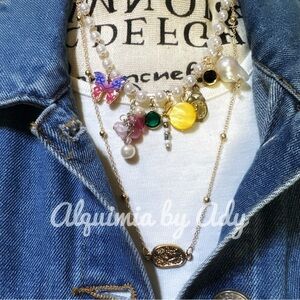 Elegant necklace with pearls and multicolor charms. Features butterfly, green, pink, and yellow accents. Perfect for any occasion.